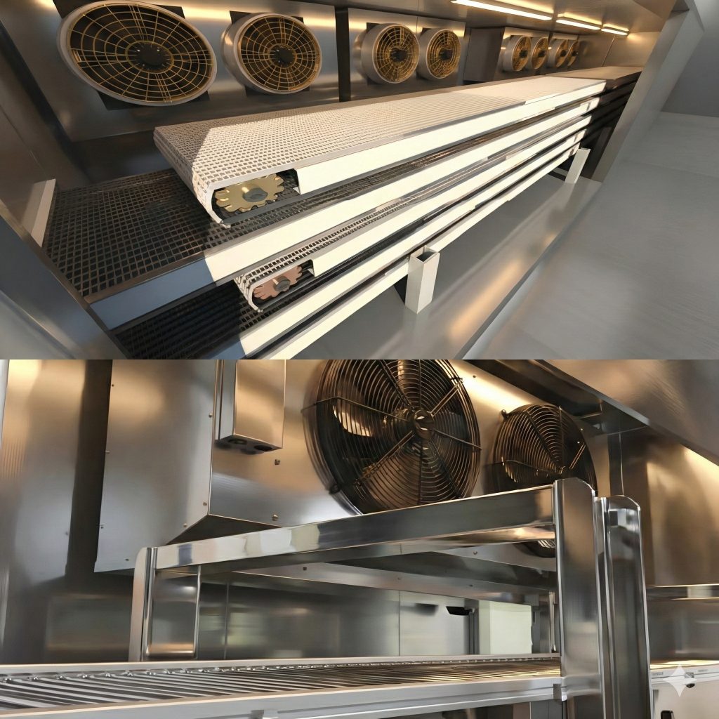 고효율 다분할 유동 기류: 터널 내부에 다수의 고성능 팬을 배치하여 냉기가 제품 표면에 고르게 전달되도록 설계, 대량 물량도 사각지대 없이 균일하게 동결합니다.