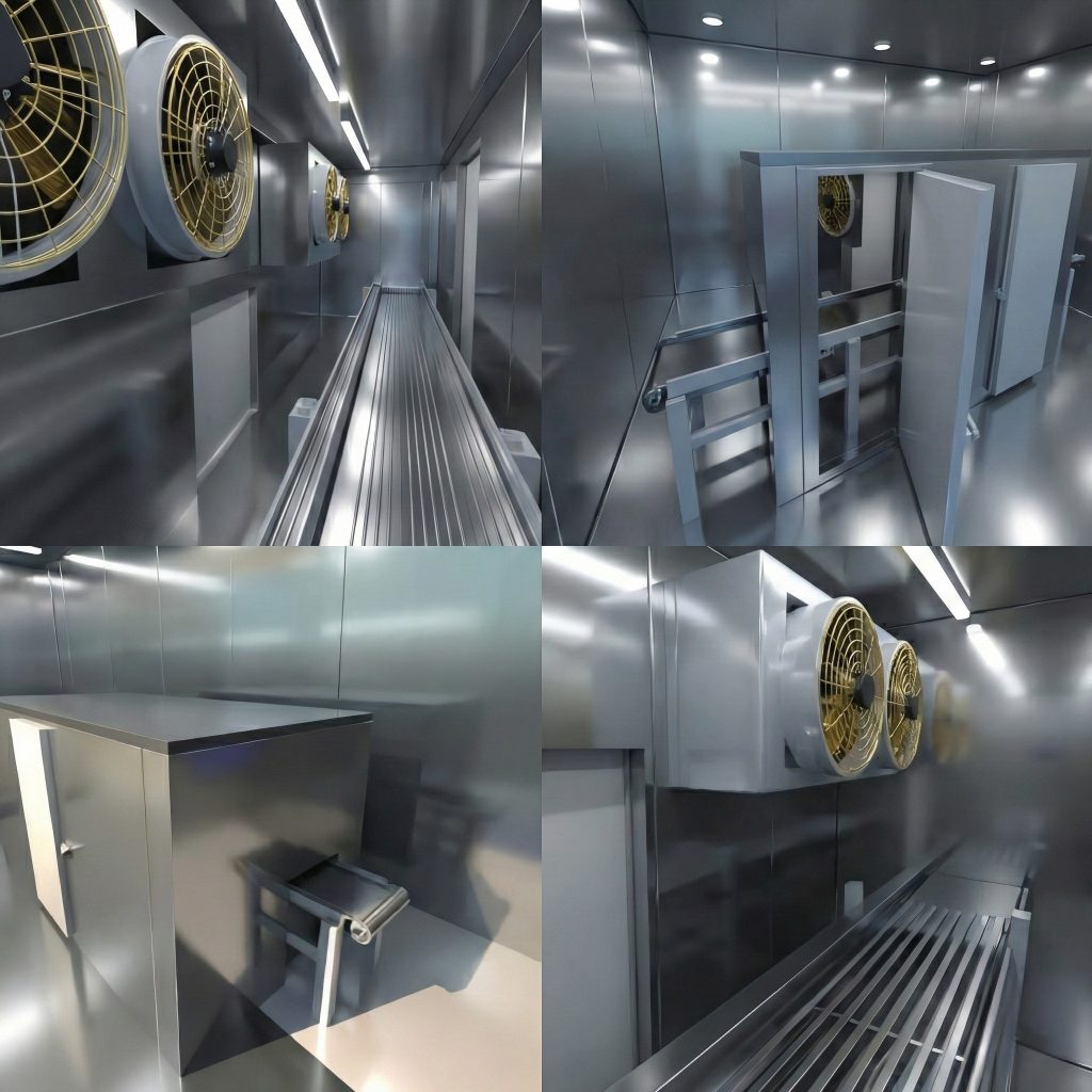 식품의 안전과 에너지 효율은 결코 타협할 수 없는 가치입니다. 당사의 터널 프리저는 초고밀도 특수 우레탄 패널을 적용하여 외부 열 유입을 완벽히 차단하고 내부 온도를 일정하게 유지합니다. 또한, 기본적으로 제공되는 스테인리스 스틸 바닥재와 더불어 컨베이어 스크래퍼(Scraper), 그리고 선택 사항인 CIP(NET 세척 시스템)를 통해 위생 관리가 까다로운 생산 라인에서도 박테리아 증식을 억제하고 항상 청결한 상태를 유지할 수 있도록 지원합니다.